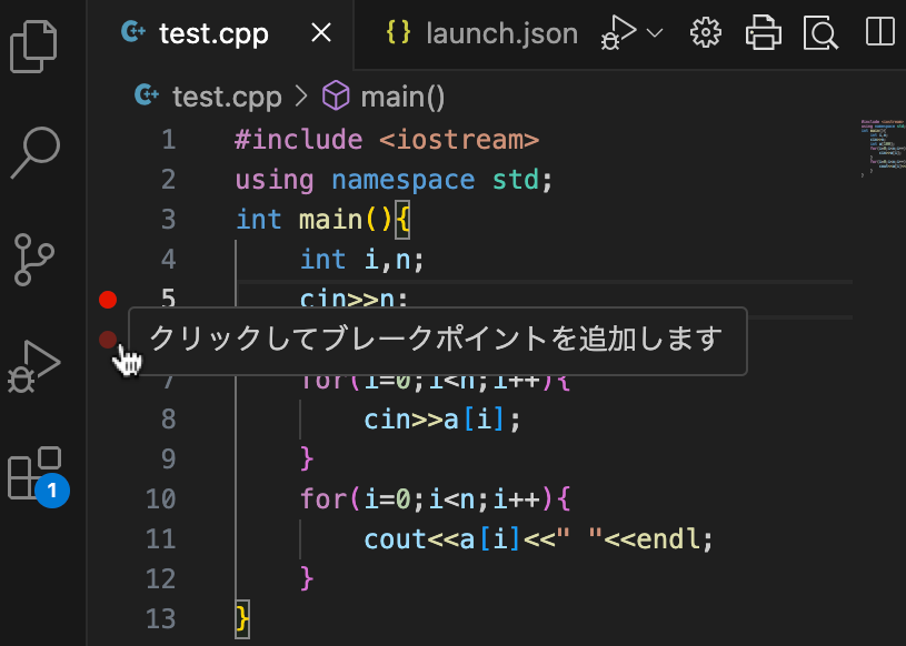 行番号の左側をクリックすることでブレークポイントを追加できます。