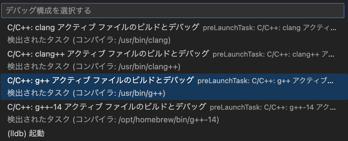 すると、いくつか選択肢が出てきますが、ここではC/C++: g++ アクティブ ファイルのビルドとデバッグを選択します