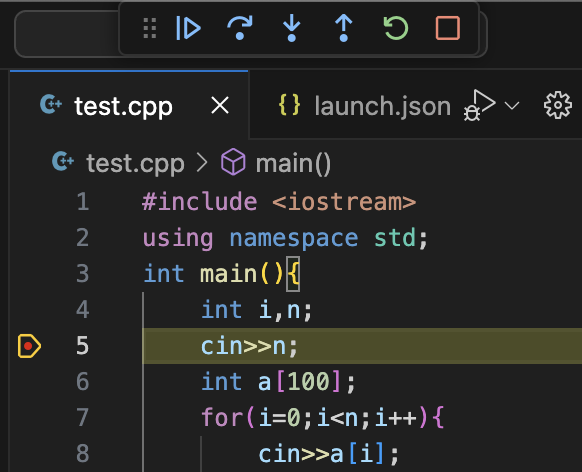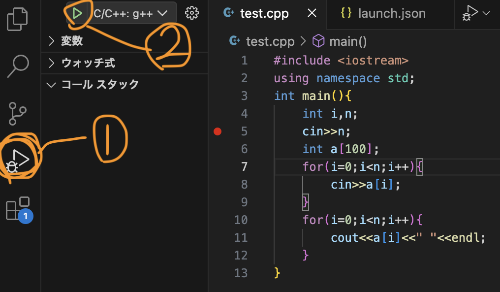 また、vsc側では設定したブレークポイントでプログラムが停止していることが確認出来ます。必要な入力(cinやscanfなど)がある場合は、先ほど生成されたコンソールに入力しておきます。入力が複数ある場合はまとめて(スペース区切りまたは改行区切りで)入力しておくと楽です