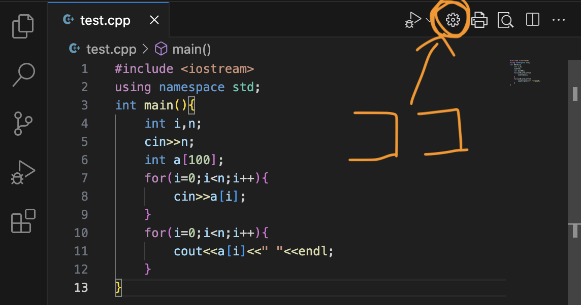 デバッグをしたいソースファイルを開いた状態で、右上の歯車マークを押します。