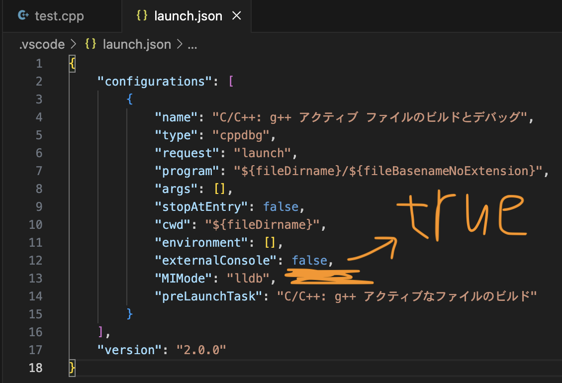 そうすると、.vscodeというフォルダが生成されており、中にlaunch.jsonがあるので、 "externalConsole":の項目をtrueに変更します。